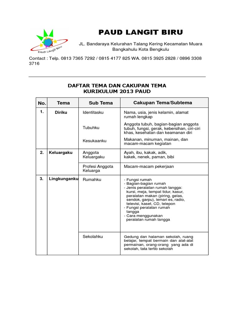 Tema dan sub tema paud semester 2 tahun ajaran 2015/2016 fungsi tema pembelajaran paud adalah menyatukan isi program pengembangan dalam satukesatuan yang utuh, memperkaya perbendaharaan kosa kata peserta didik.